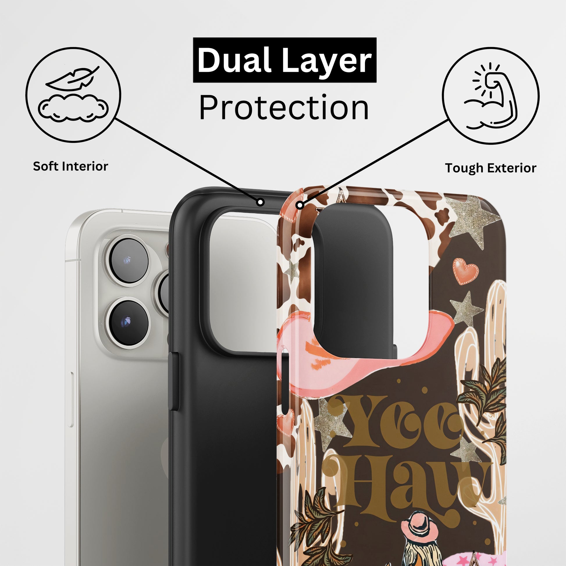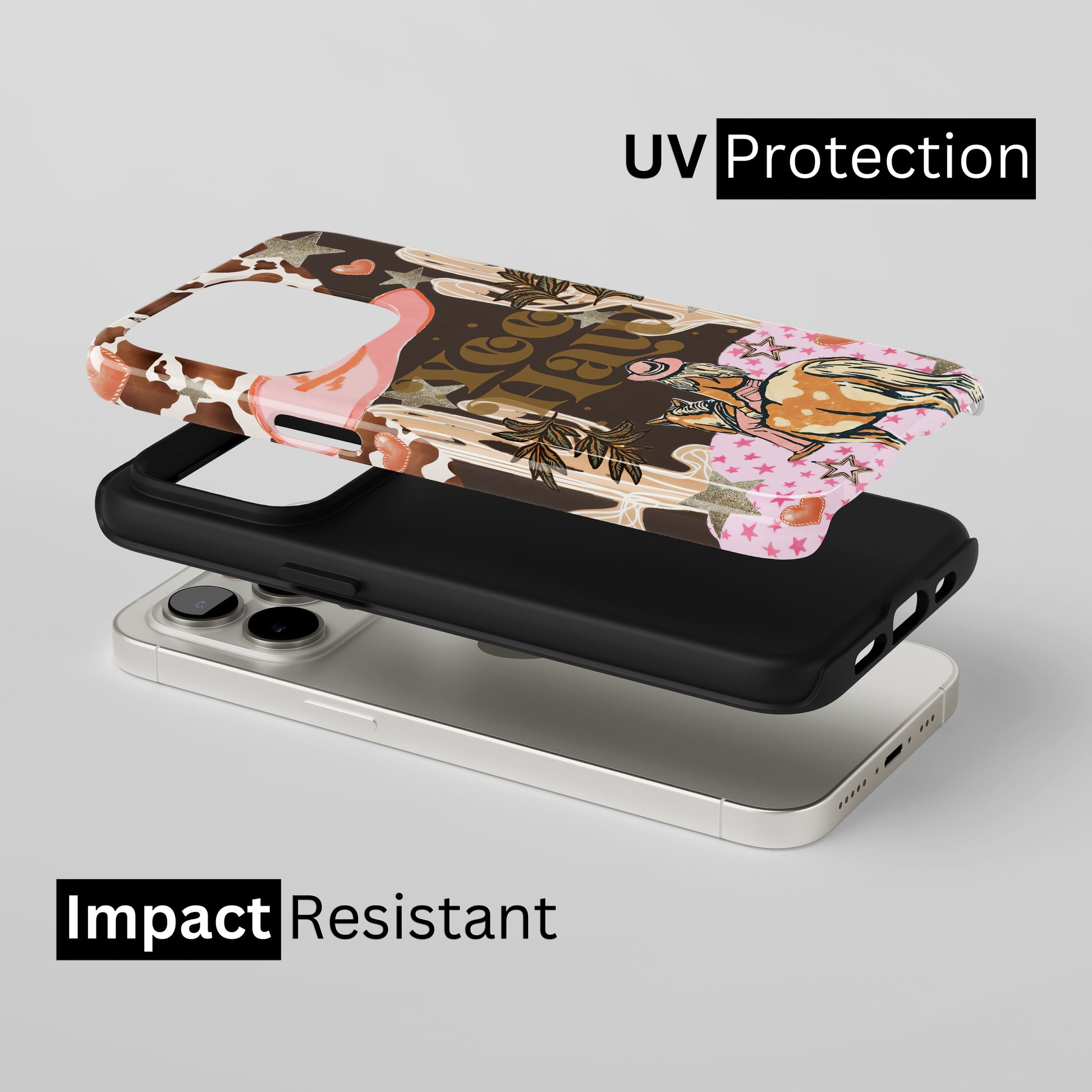 Protect your phone with a dual-layer case made for and compatible with iPhone devices. Durable, shock-absorbing, UV-protected, and wireless charging compatible. Choose matte or glossy with full-wrap 3D print and clear, open ports for easy access.