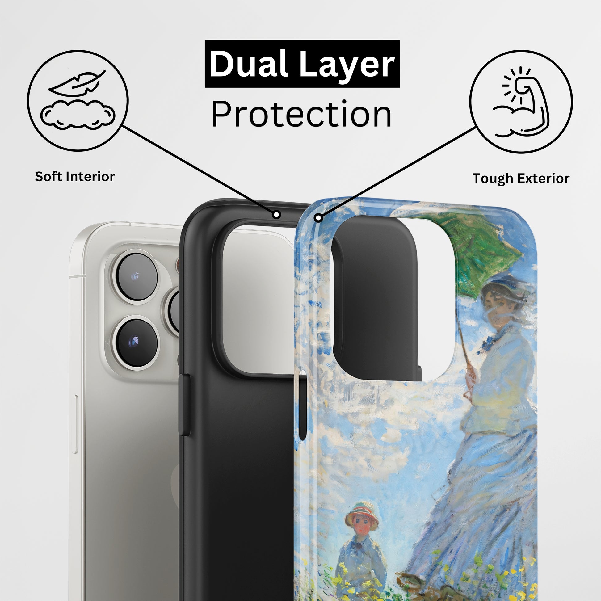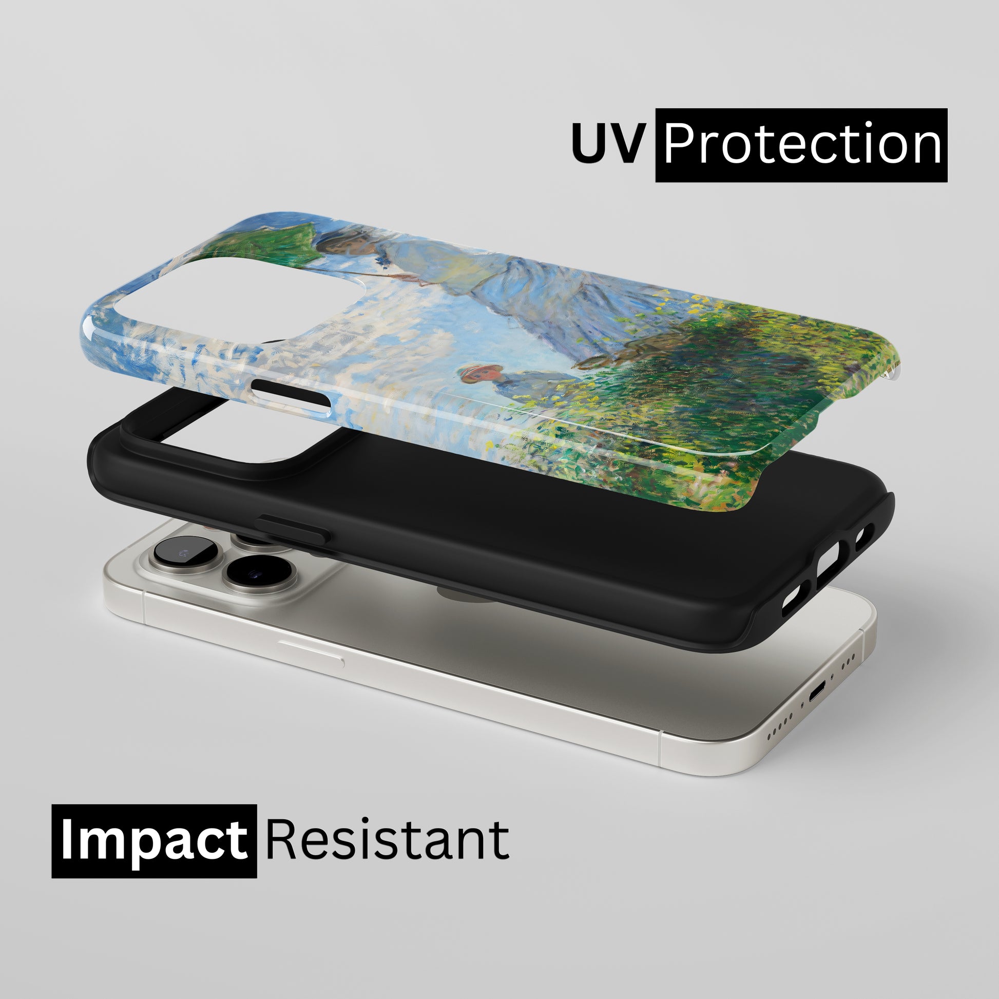 Protect your phone with a dual-layer case made for and compatible with iPhone devices. Durable, shock-absorbing, UV-protected, and wireless charging compatible. Choose matte or glossy with full-wrap 3D print and clear, open ports for easy access.