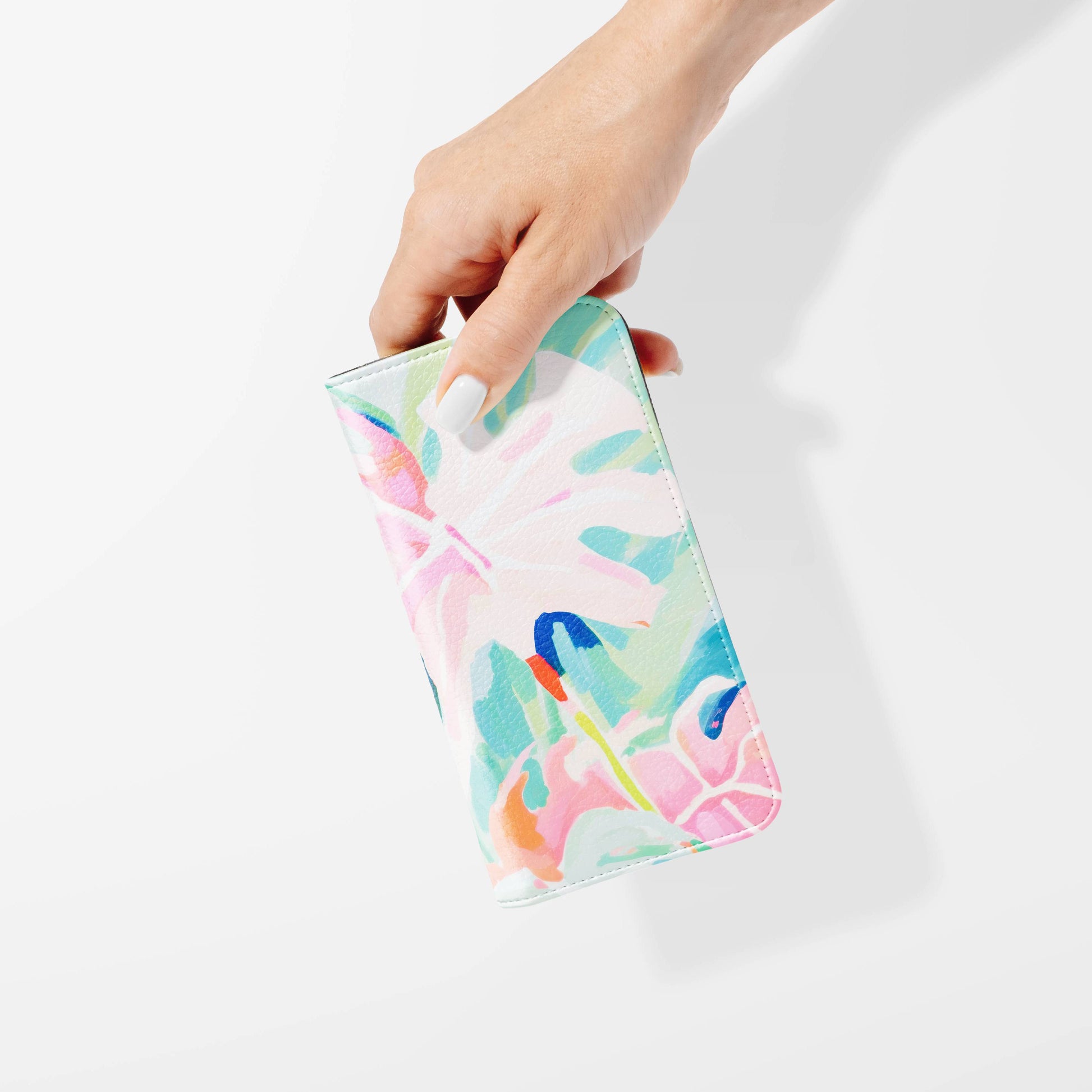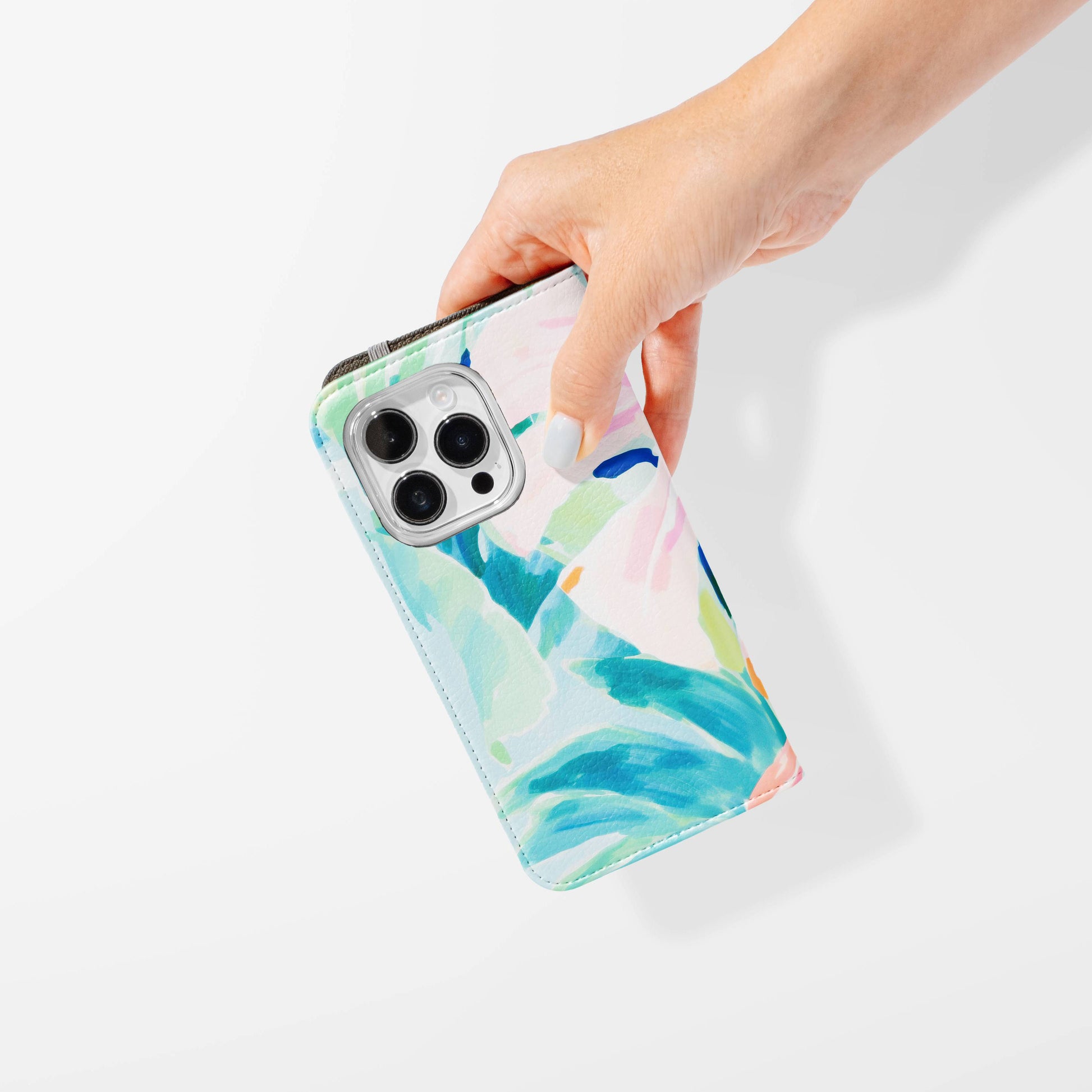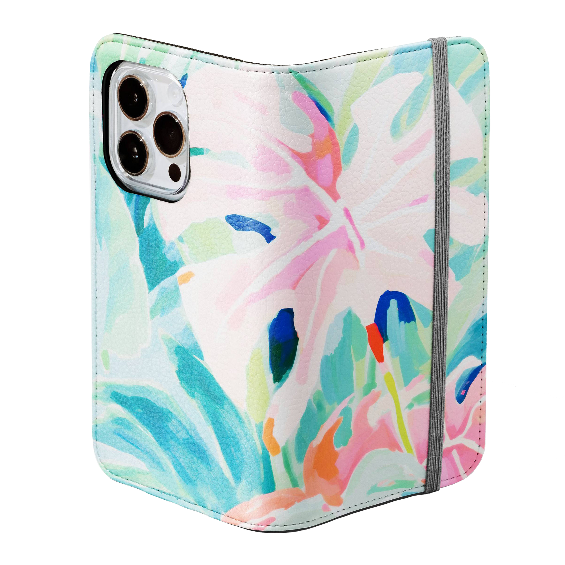 Kick your phone’s style up a notch with our vegan leather folio case! It’s got bold designs, a tough polycarbonate core, and a stretchy strap to keep it snug. Stash cards and cash, pop it up for videos, and clip on a strap for easy carrying!