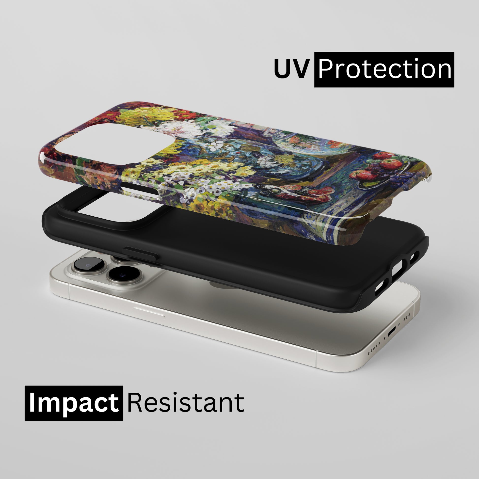 Protect your phone with a dual-layer case made for and compatible with iPhone devices. Durable, shock-absorbing, UV-protected, and wireless charging compatible. Choose matte or glossy with full-wrap 3D print and clear, open ports for easy access.